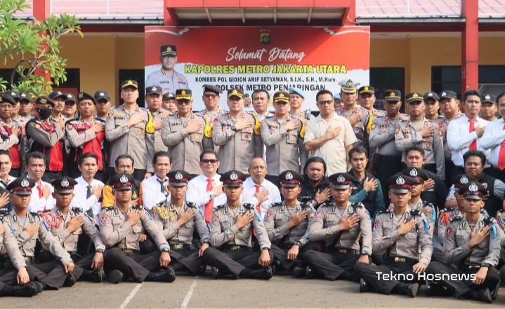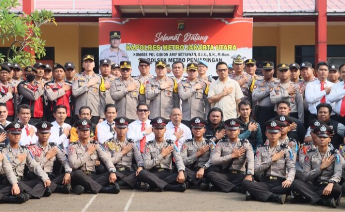 Jakarta – Apel pagi di Halaman Polsek Penjaringan, Jakarta Utara, dipimpin Kapolres Metro Jakarta Utara KOMBES POL GIDION ARIF SETYAWAN, S.I.K, M.Hum dalam rangka kesiapan Pemilu 2024 , Selasa (21/11/2023).