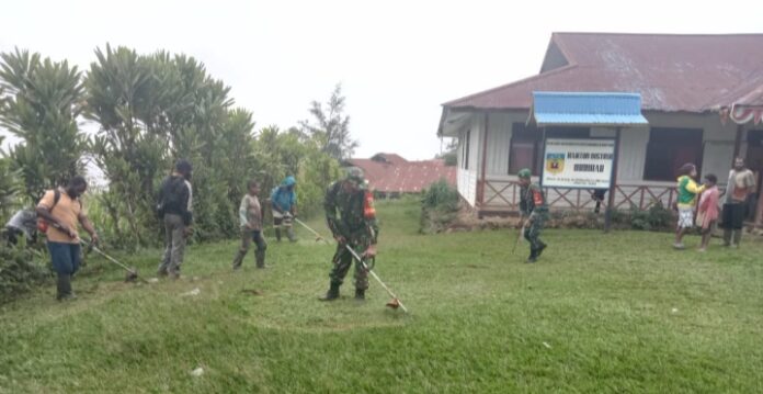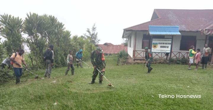 Babinsa Okbibab Bersama Masyarakat Gelar Karya Bakti Bersihkan Kantor Distrik