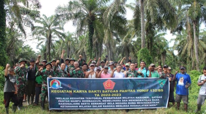 Kab.Keerom – Satgas Pamtas Yonif 132/BS Pos Kotis bersama masyarakat menggelar kegiatan Jumat Bersih yakni dengan membersihkan lingkungan sekitar di Kp.Wonorejo, Distrik Mannem, Kab.Keerom, Prov.Papua pada hari Jumat (09/12).
