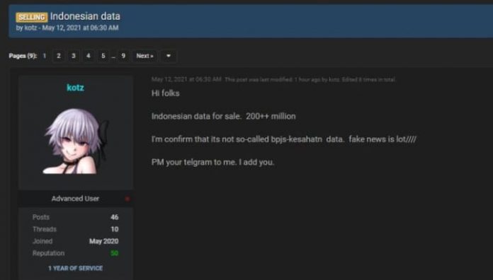 Tangkapan layar dari salah satu akun yang memperdagangkan data pribadi warga Indonesia beredar di media sosial.