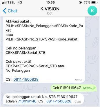• Maka secara otomatis pada saat berhasil sehingga akan langsung dijawab oleh bot dengan isi nomor ID pelanggan K Vision yang dapat digunakan.