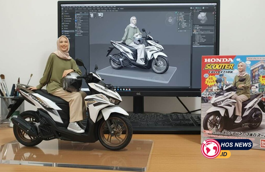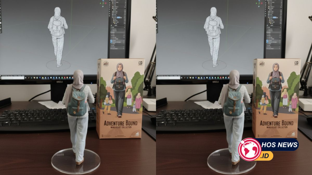Contoh prompt: “Buat figurin komersial skala 1/7 dari karakter dalam foto, bergaya realistis, diletakkan di atas meja komputer dengan alas akrilik transparan. Di layar monitor terlihat proses pemodelan figurin, dan di sampingnya terdapat kotak mainan bergaya dengan ilustrasi 2D.”