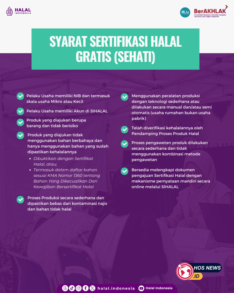 Pelaku usaha mikro kecil (UMK) yang mengikuti program program SEHATI mendapatkan fasilitas sertifikat halal gratis dari pemerintah.