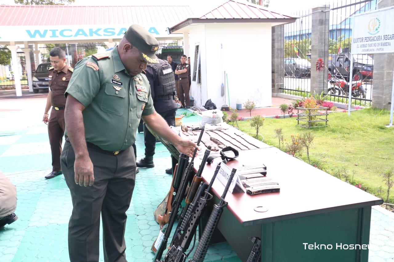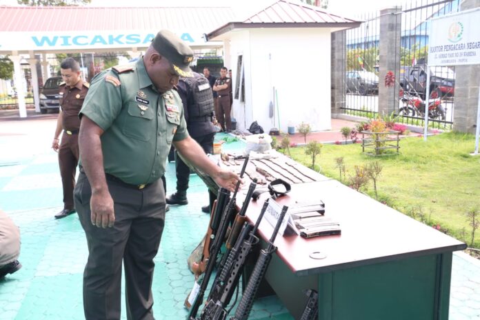 Wamena – Komandan Kodim 1702/JWY Letkol Cpn Athenius Murip, S.H., M.H., hadiri pemusnahan barang bukti sitaan dan rampasan yang telah berkekuatan hukum tetap, bertempat di Kantor Kejaksaan Negeri Jayawijaya, jalan Ahmad Yani, Distrik Wamena, Kabupaten Jayawijaya, Provinsi Papua Pegunungan, Rabu (12/07/2023).