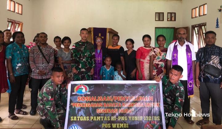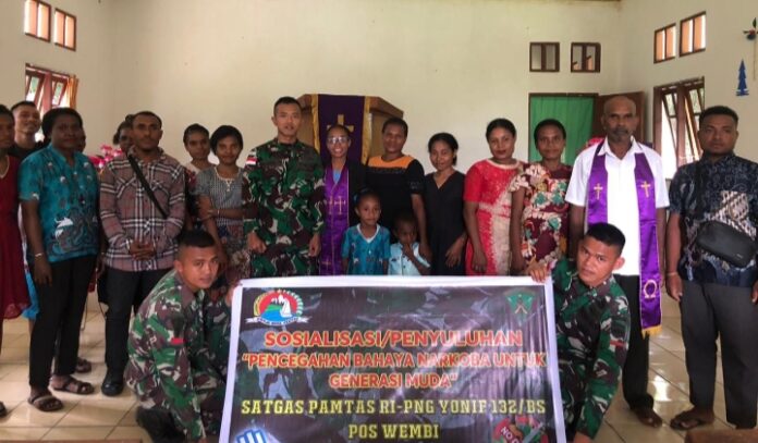 Kab.Keerom – Satgas Pamtas RI-PNG Sektor Utara Yonif 132/BS Pos Wembi melaksanakan penyuluhan bahaya penyalahgunaan narkoba bagi generasi muda Di Kp.Piyawi, Distrik Mannem, Kab.Keerom, Provinsi Papua, Rabu (22/02/2023).
