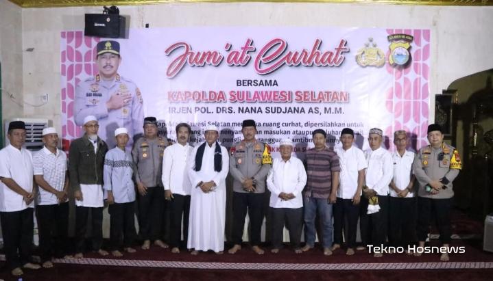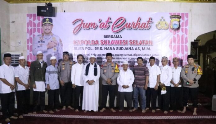 SULAWESI SELATAN – Kapolda Sulsel Irjen Pol Nana Sudjana menampung berbagai aspirasi masyarakat melalui program Jumat Curhat yang diadakan di Mesjid Syuhada 45 Mapolda Sulsel, Jumat (30/12/2022).