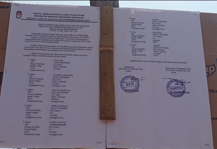 BANGKALAN-Salah satu Bakal Calon Kepala Desa Duwek Buter, Kwanyar, Bangkalan, bakalan berususan dengan polisi. Bacakades berinisial AM diduga mendaftarkan diri menjadi Bacakades Duwek Buter dengan menggunakan SK Pengangkatan Perangkat Desa yamg diduga dipalsu.