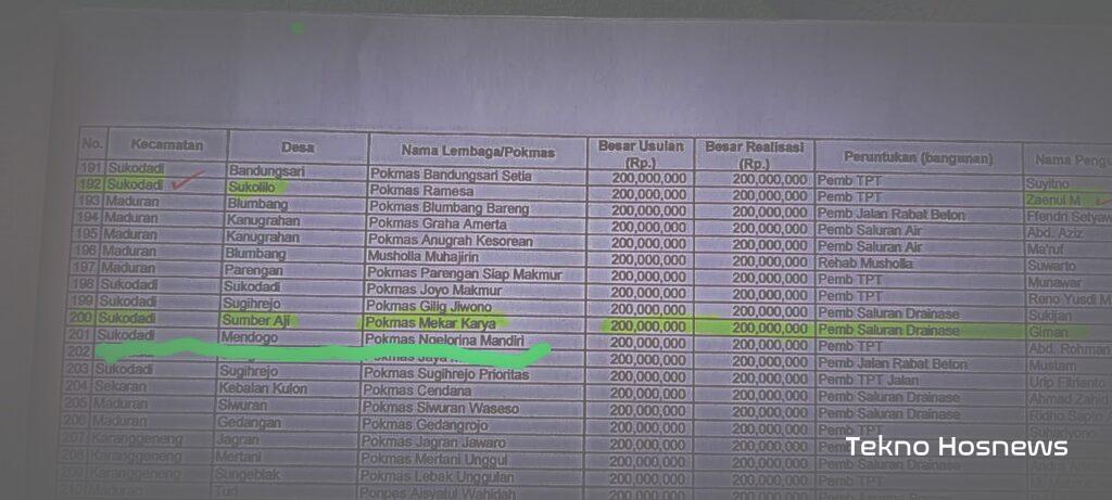 Desa Sumberaji (Pokmas Mekar Jaya) Rp. 200 juta untuk pembangunan saluran drainase. Desa Sukolilo (Pokmas Ramesa) senilai Rp. 200 juta, untuk pembangunan Tembok Penahan Tanah (TPT). Desa Mendugo (Pokmas Ngelorina Mandiri) Rp. 200 juta, untuk pembangunan Tembok Penahan Tanah (TPT).