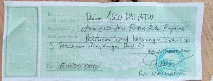 Dilain waktu Oknum Ketua RW 003 telah meminta Uang sebesar Rp. 5.500.000 ( Lima Juta Lima Ratus Ribu Rupiah ) untuk perijinan SKU ( Surat Keterangan Usaha) dengan Kwitansi terlampir sebagai bukti beserta stempel.