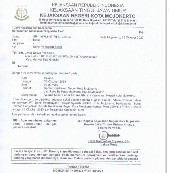 Adapun diantara Saksi yang mendapatkan panggilan Kejaksaan Negeri Kota Mojokerto sdr Catur Setyo Prabowo ia dipanggil Untuk didengar dan diperiksa sebagai saksi dalam perkara dugaan tindak pidana korupsi dalam pembiayaan PT Bank Pembiayaan Rakyat Syariah (BPRS) kota Mojokerto berdasarkan surat perintah penyidikan kepala Kejaksaan Negeri Kota Mojokerto nomor Print-02/M.5.4 .7/fd.1/10/2023 tanggal 23 Oktober 2023 a.n tersangka Choirudin, S.Hi.