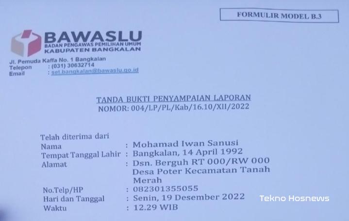 (IS) sempat menghubungi Ketua Bawaslu untuk membuat laporan, namun Ketua Bawaslu mengarahkan Pelapor kepihak Layanan Informasi yang di temui oleh Mustofa SK, SH,. Dengan Nomor Laporan: 004/LP/PL/Kab/16.10/XII/2022 dan laporan itu oleh pihak Pelapor (IS) juga di sampaikan ke Ketua Bawaslu Bangkalan melalui Via WhatsApp, pada Senin (19/12/2022) siang.