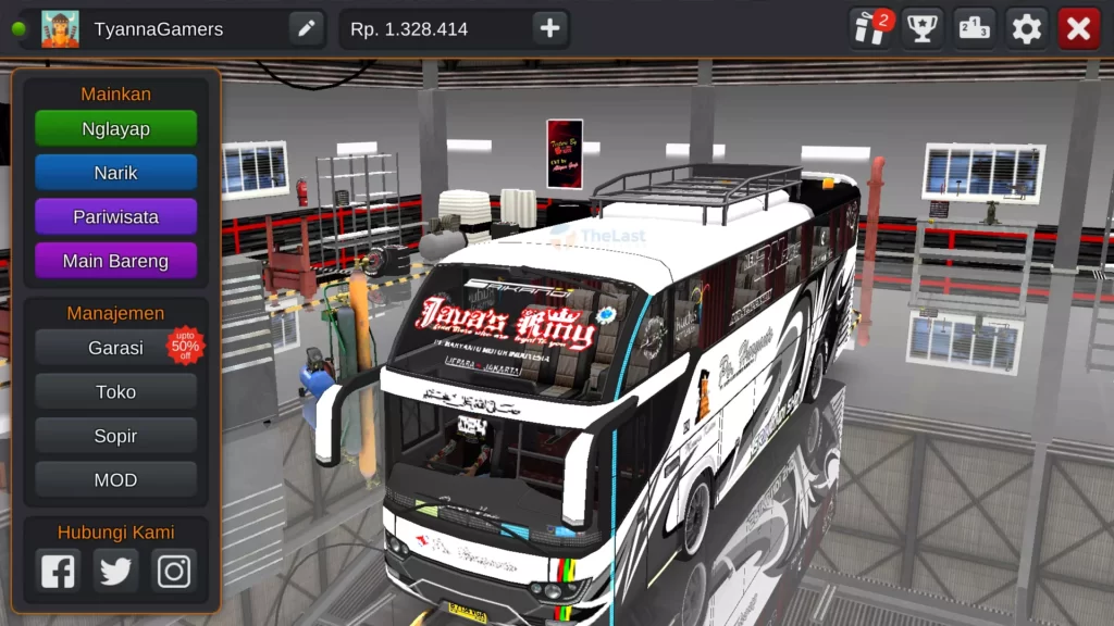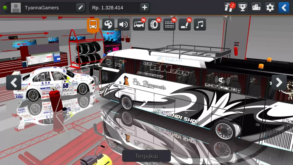 Garasi yang dimaksud di sini adalah bagian awal game pada saat game dibuka, atau sebelum kita bermain dimana kita bisa melakukan modifikasi pada bus dan sebagainya.