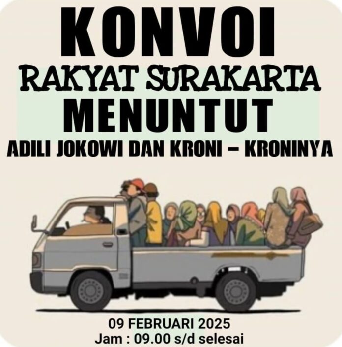 SOLO, hosnews.id – Aksi unjuk rasa besar-besaran menuntut Joko Widodo untuk diadili akan dilakukan para mahasiswa dari berbagai kampus dan warga masyarakat Solo, berpusat di kediaman mantan Presiden Indonesia ke 8 bersama peserta car free day sepajang jalan utama menuju kampus Universitas Sebelas Maret, Jl. Ir. sutami Solo, pada hari Ahad, 9 Februari 2025.