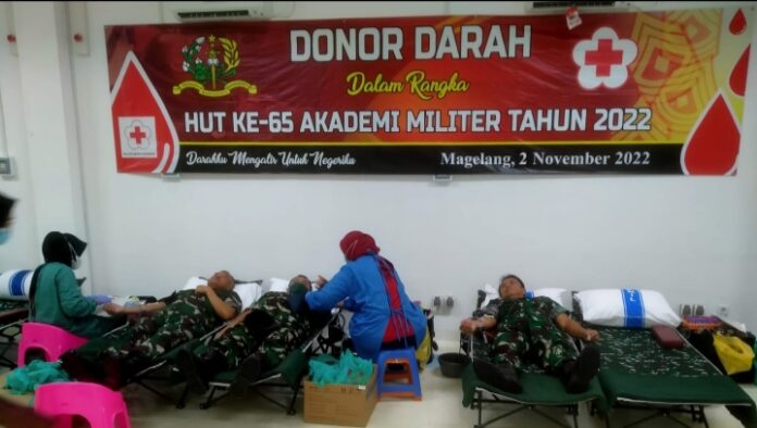 MAGELANG – Gubernur Akademi Militer Mayjen TNI Legowo W. R. Jatmiko, S.I.P., M.M. bersama para Perwira Tinggi Akademi Militer dan Pejabat Distribusi Akademi Militer serta Ketua dan Wakil Ketua Persit Kartika Chandra Kirana Cabang BS Akademi Militer memimpin organik Akmil baik militer dan PNS serta anggota Persit Kartika Chandra Kirana Cabang BS Akademi Militer untuk melaksanakan donor darah dalam rangka rangkaian peringatan HUT ke-65 Akademi Militer Tahun 2022, bertempat di Kesehatan Akademi Militer, Rabu (02/10/2022).