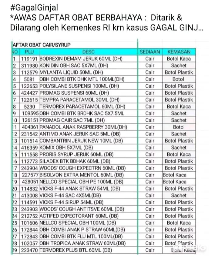 “Sudah kami lakukan imbauan agar menyetop semua jenis dan merek sirup. Itu kami lakukan atas perintah dari Dinkes Provinsi,” ujarnya, Jumat (21/10/2022).