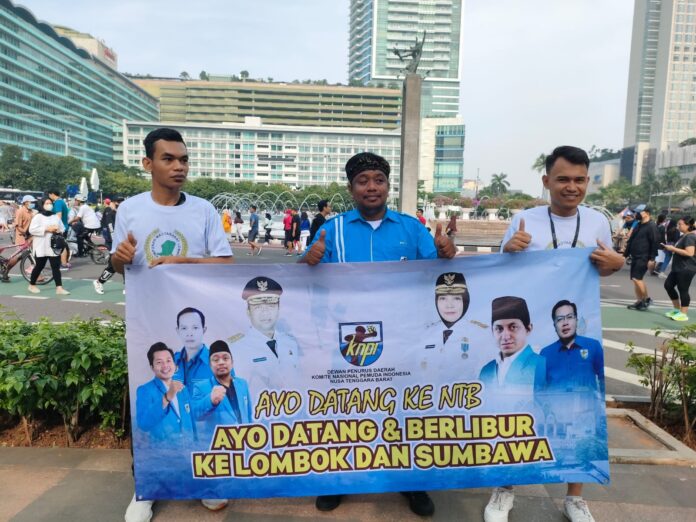 JAKARTA -Bantu pariwisata di Lombok dan Sumbawa, Dewan Pengurus Daerah Komite Nasional Pemuda Indonesia (DPD KNPI) Nusa Tenggara Barat (NTB), menggelar kampanye wisata bertajuk “Ayo Datang Berlibur ke Lombok dan Sumbawa” di lokasi hari bebas berkendara atau car free day (CFD), Bunderan HI, Jakarta, Minggu (25/9/2022).