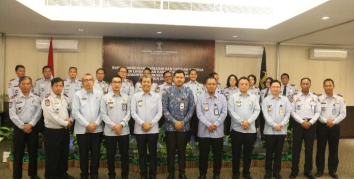 DENPASAR – Untuk melakukan perumusan resolusi, strategi dan langkah kerja dalam pelaksanaan program, anggaran, dan kegiatan pada tahun 2023 berdasarkan evaluasi pencapaian kinerja pada tahun 2022, Kantor Wilayah Kementerian Hukum dan HAM Bali menyelenggarakan kegiatan Rapat Koordinasi Evaluasi dan Capaian Kinerja T.A 2022 di Lingkungan Kantor Wilayah Kementerian Hukum dan HAM Bali Tahun 2023, Senin (30/1/2023).