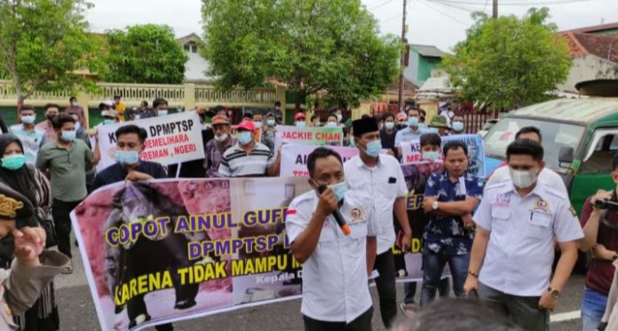 Bangkalan, Hosnews.id-|| Puluhan pemuda melakukan aksi demo di depan kantor Dinas Penanaman Modal, Perizinan Terpadu atu Pintu (DPM-PTSP) Kabupaten Bangkalan.
