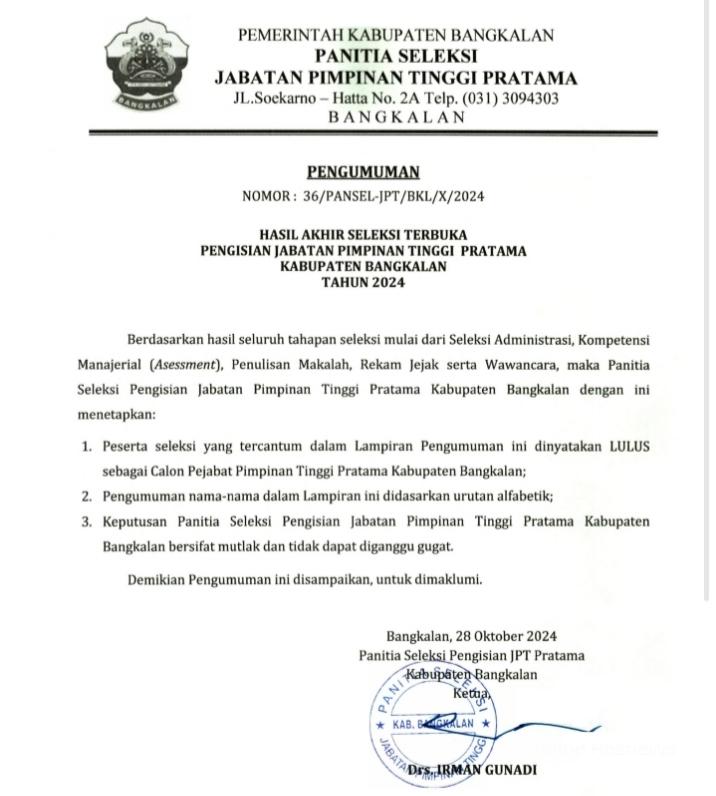 “Berdasarkan No:36/Pansel-Jpt/Bkl/X/2024 hasil seluruh tahapan seleksi, mulai seleksi Administrasi, Kompetensi Manajerial [Asesment], Penulisan Makalah, Rekam Jejak serta Wawancara, maka Panitia Seleksi Pengisian Jabatan Pimpinan Tinggi Pratama Kabupaten Bangkalan dengan ini menetapkan;