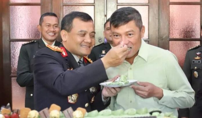 SEMARANG – Momen penuh rasa kehangatan terlihat saat Kapolda Jateng Irjen Pol Ahmad Luthfi beserta sejumlah pejabat utama dan Staf mengunjungi Puri Wedari, rumah dinas Pangdam IV/ Diponegoro, Kamis (5/10/2023) .