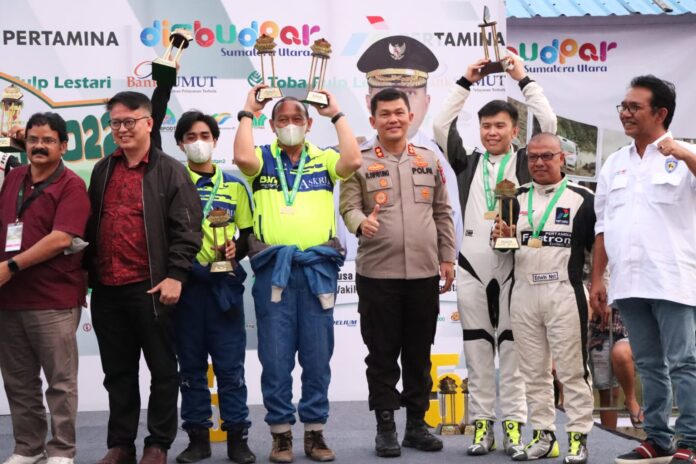 SIMALUNGUN – Dirlantas Polda Sumut Kombes Pol Indra Darmawan Irianto, SIK, M.Sc, dengan didampingi oleh Kapolres Simungun AKBP Ronald F.C Sipayung, S.H., S.I.K., M.H., menghadiri Penutupan (Closing Ceremonial) Even Danau Toba Rally 2022 Kejuaraan Nasional Putaran Pertama Dengan Ceremonial Pengibaran Bendera Finis Rally Danau Toba 2022 di Terminal Sosor Sabah Parapat Kecamatan Girsang Sipangan Bolon, Kabupaten Simalungun, Sumut, Minggu (7/8/2022) sore sekira pukul 16.00 WIB.