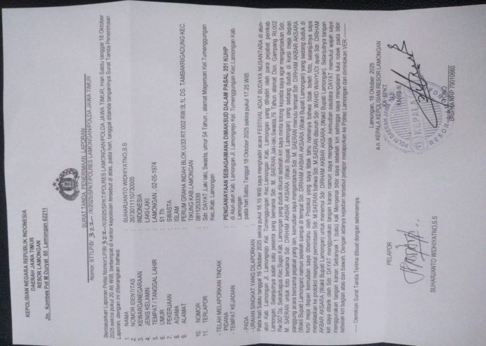 Dalam laporan tersebut, korban menerangkan bahwa peristiwa terjadi pada Sabtu, 18 Oktober 2025 sekitar pukul 17.25 WIB di Alun-Alun Lamongan, saat berlangsungnya acara Festival Adat Budaya Nusantara yang dihadiri para pejabat daerah, tokoh budaya, dan undangan dari berbagai daerah.