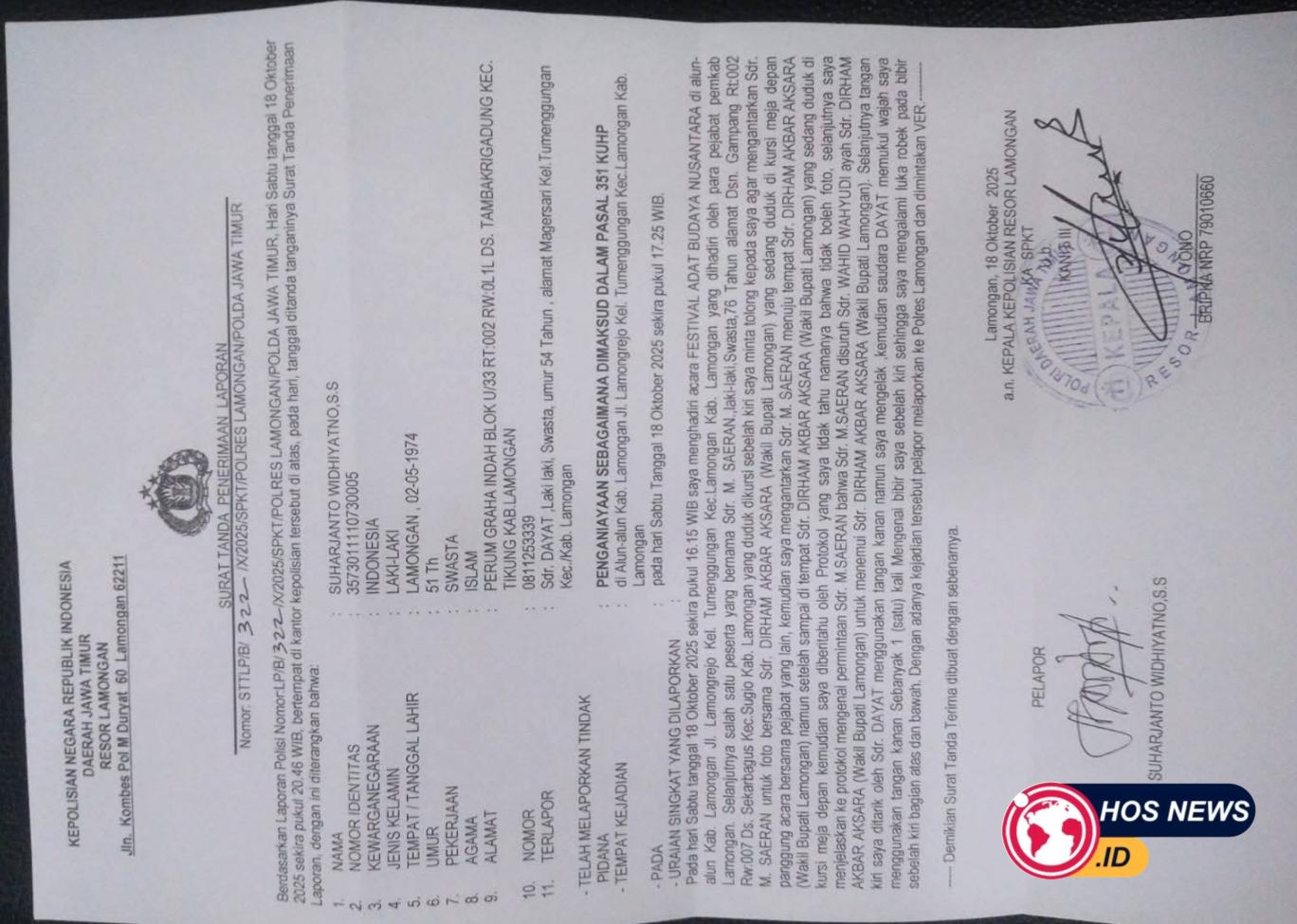 Korban telah melaporkan insiden pemukulan tersebut ke Polres Lamongan, Polda Jawa Timur, sebagaimana tercantum dalam Surat Tanda Penerimaan Laporan Polisi Nomor STTLP/B/322/X/2025/SPKT/POLRES LAMONGAN/POLDA JAWA TIMUR, tertanggal 18 Oktober 2025.