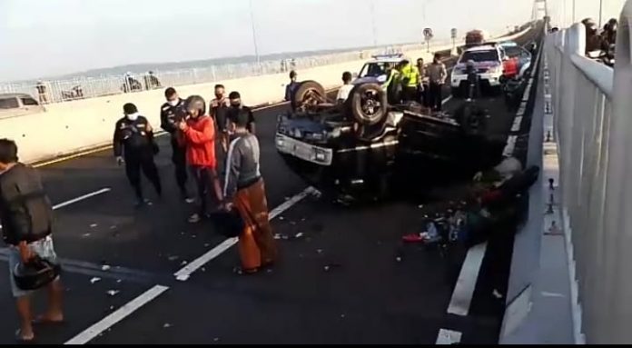 BANGKALAN Hosnews.id-Sebuah mobil pick-up oleng menabrak pembatas jembatan Suramadu arah Madura-Surabaya pada Jum’at, 19 maret 2021 sekira pukul 06.00 WIB.