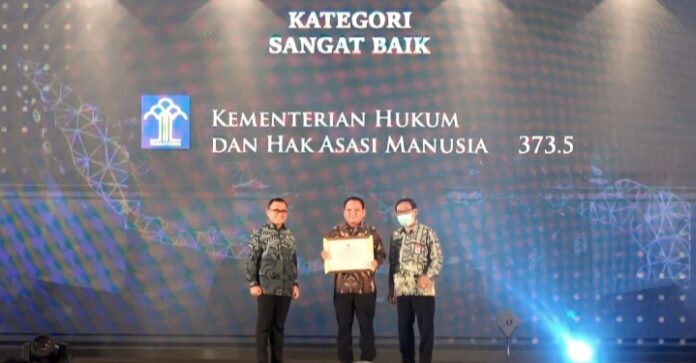 JAKARTA – Kementerian Hukum dan HAM (Kemenkumham) mendapatkan penghargaan Penerapan Sistem Merit pada Manajemen ASN dengan predikat sangat baik. Kemenkumham memperoleh nilai 373.5 poin berdasarkan evaluasi Komisi ASN.