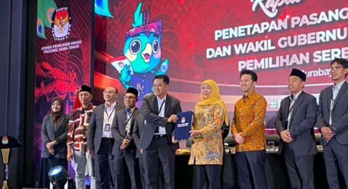 “Menetapkan pasangan calon nomor urut 2 Khofifah Indar Parawansa-Emil Elestianto Dardak sebagai pasangan calon Terpilih. Selain itu, Pj Gubernur Jatim Adhy Karyono dan Wakil Ketua DPRD Jatim Sri Wahyuni dan forkopimda juga turut hadir. Hadir pula jajaran Bawaslu Jatim dan KPU dari tingkat Kabupaten/kota di Jawa Timur.