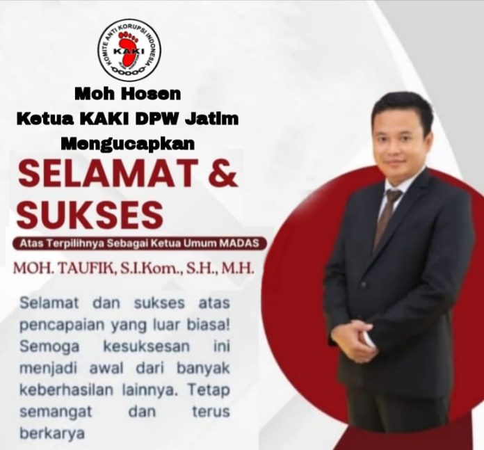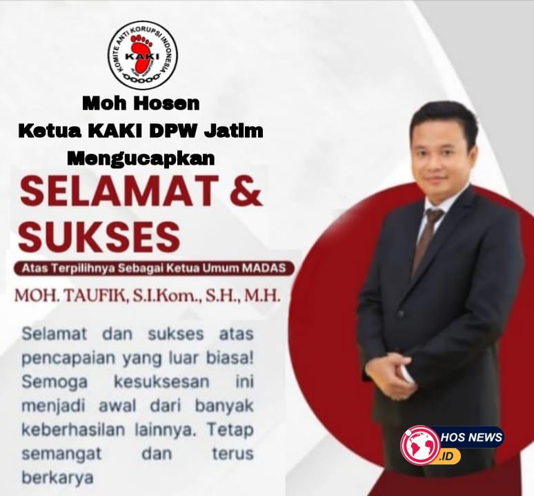 Dalam kesempatan ini, Moh Hosen Ketua Komite Anti Korupsi Indonesia (KAKI) Dewan Pimpinan Wilayah Provinsi Jawa Timur mengucapkan selamat dan sukses atas terpilihnya Moh Taufik, S.I.Kom, S.H., M.H menjadi Ketua Umum Madura Bersatu (Madas). Ini merupakan Amanah yang harus dijunjung tinggi dan jangan sampai merusak Marwah dan Martabat Suku Madura," kata Hosen KAKI Jatim," Kamis (07/08/2025).
