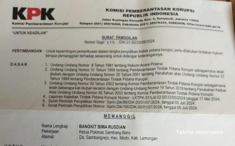 Diketahui dampak rentetan kasus korupsi dana hibah provinsi Jawa Timur, Penyidik Komisi Pemberantasan Korupsi (KPK) memanggil Bangkit Bima Rusdian Ketua Pokmas Sambang Baru dusun Sambangrejo Kecamatan Modo Kabupaten Lamongan, Jumat 23 Agustus 2024