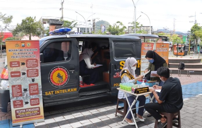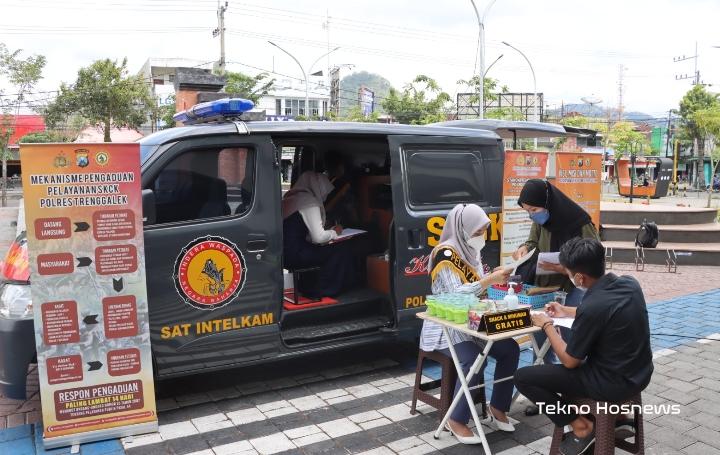 Polres Trenggalek kini melalui Satintelkam membuka pelayanan SKCK keliling yang ditempatkan pada pusat keramaian seperti pasar, alun-alun maupun fasilitas publik lainnya yang kerap menjadi jujukan aktivitas warga.