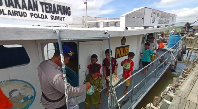“Kegiatan perpustakaan terapung ini dipimpin Komandan Kapal beserta ABK dan pelaksanaan berjalan aman dan kondusif,” ungkap Dir Pol Airud Polda Sumut. (Leodepari)