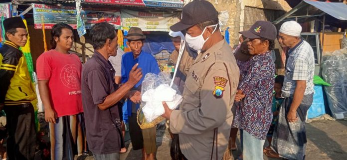 Tampak, dalam kesempatan itu Kanit supriady bersama anggota yg lain sesekali memasangkan masker kepada pengunjung pasar yg kedapatan tak mengenakan masker.