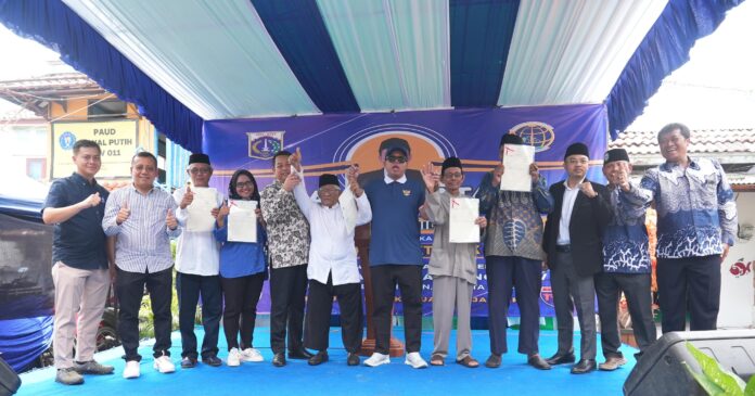 Jakarta – Menteri Agraria dan Tata Ruang/Kepala Badan Pertanahan Nasional (ATR/BPN), Nusron Wahid, menyerahkan secara simbolis 5 Sertipikat Hak Guna Bangunan (SHGB) kepada warga Kampung Nelayan Muara Angke, Pluit, Penjaringan, Jakarta Utara pada hari Minggu (16/02/2025).