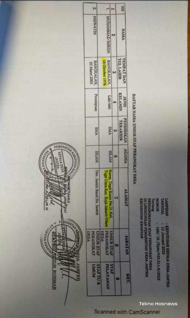 Kemudian, sesuai Undang-Undang Desa dan juga Perda, ditegaskan bahwa perangkat desa yang diangkat haruslah paling kurang tinggal didesa tersebut selama 1 tahun sebelum diangkat. Dan, harus penduduk (ber KTP) desa setempat. “Nah di dalam SK pengangkatan perangkat desa Janteh itu, tertulis kalau M. Imron tinggal di Jakarta Utara, sesuai dengan KTP-nya,” kata Risang.