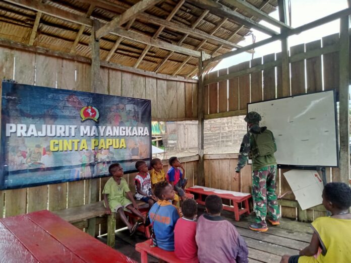 Berangkat dari perhatian tersebut, maka hari Minggu siang pasca waktu ibadah, Lettu Inf Galih mengundang anak-anak usia SD dari Kampung Alguru untuk mengikuti kegiatan tambahan pelajaran yang disampaikan langsung oleh para Prajurit TNI.