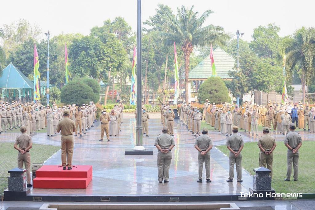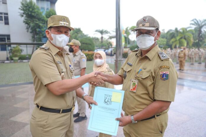 Proses pemberian piagam penghargaan dan hadiah televisi dilaksanakan saat kegiatan Apel Pagi Aparatur Sipil Negara (ASN) di Halaman Plaza Barat, Kantor Walikota Kota Administrasi Jakarta Utara, Senin (20/6).