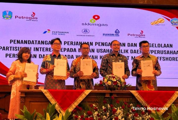 Penandatanganan perjanjian dilakukan Direktur PT PHE WMO, Endro Hartanto, Chief Representative Kodeco Energy Kwak Sang Hyuk. Dirut PT MMB Ali Hanafia Lijaya dan Dirut PT PJA Budiyanto, di Ruang Binaloka Kantor Gubernur Jatim di Jalan Pahlawan Surabaya, Rabu (9/8/2023) pagi.