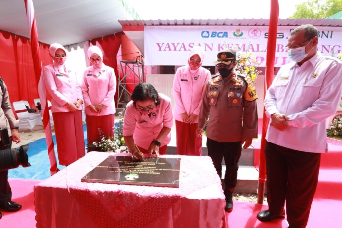 BANGKALAN – Dalam rangka peringatan hari ulang tahun Yayasan Kemala Bhayangkari (YKB) yang ke 42, Ketua Pengurus Yayasan Kemala Bhayangkari Daerah Jawa Timur Ny.Ully Nico Afinta didampingi Kapolres Bangkalan dan Pejabat Utama Polres Bangkalan, Rabu (30/3/2022) melakukan peresmian pembangunan MCK di RT 03 Kelurahan Tonjung, Bangkalan dengan jumlah penduduk sebanyak 70 Kepala Keluarga.