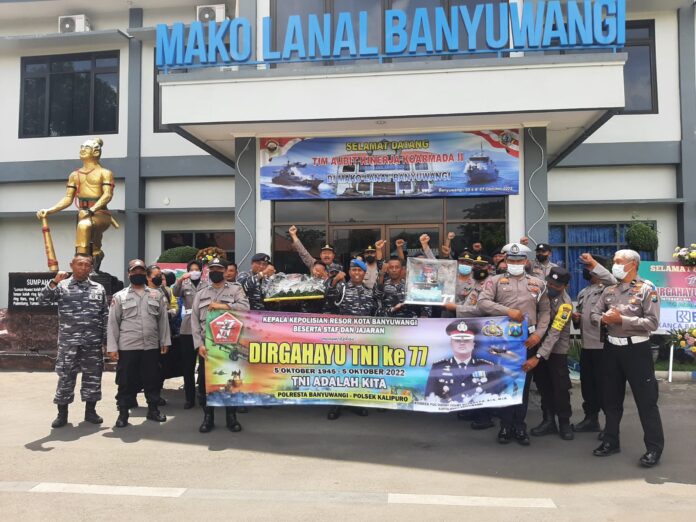 BANYUWANGI – Polsek Kawasan Pelabuhan Tanjungwangi bersama Polsek Kalipuro gelar . . pemberian tumpeng dan ucapan selamat kepada personil TNI AL di MAKO LANAL Ketapang Banyuwangi dalam rangka hari ulang tahun KE – 77 Tentara Nasional Indonesia (TNI). Rabu (5/10/2022)