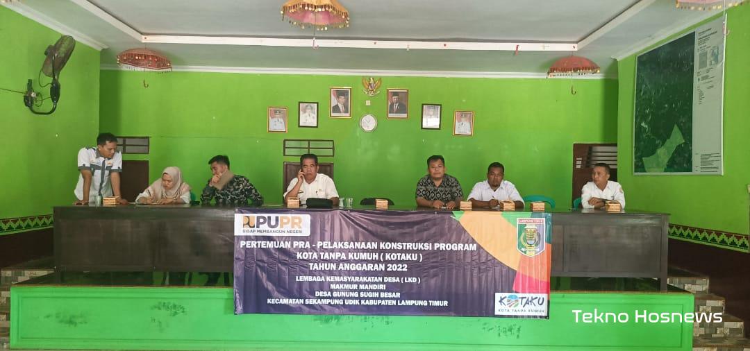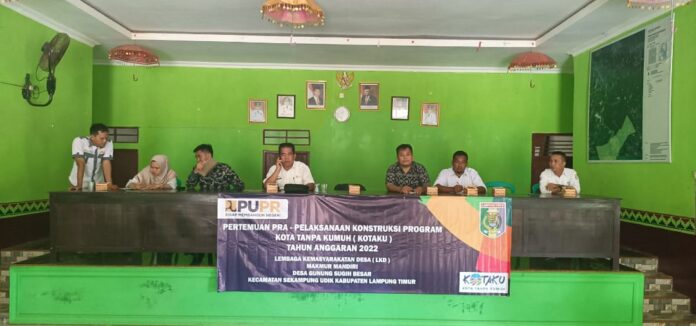 Lampung Timur – Pertemuan Pra-Pelaksanaan Konstruksi Program Kota Tanpa Kumuh (KOTAKU) tahun 2022 bersama Lembaga Kemasyarakatan Desa (LKD) di Desa Gunung Sugih Besar, Kecamatan Sekampung Udik Kabupaten Lampung Timur Provinsi Lampung pada Kamis (28/07/2022) sekira pukul 13.00 WIB sampai selesai.