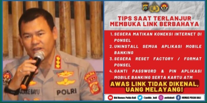 Terkait modus kejahatan baru dengan menggunakan undangan pernikahan(sudah ditangkap),meminta tolong dengan modus pertemanan serta klik-klik aplikasi, pengiriman barang lewat online. Dalam hal itu Polda bali meminta krjasama masyarakat segera melaporkan kepos polisi terdekat bila menemukan keanehan sesegera mungkin,biar bisa ditindak lanjuti,dalam hal ini jangan mudah terbujuk rayu,ujar Bayu mengakhiri.