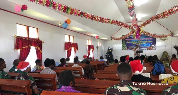 WAMENA- Hadirkan suasana sukacita di bulan penuh kasih, Yonif 756/WMS melaksanakan Ibadah Natal bersama masyarakat dan Pembagian Bingkisan serta Topi Natal kepada anak-anak Jemaat Gerja Baptis Gunung Sinay (PGBP) Kampung Gunung Susu, Distrik Hubikosi, Kab. Jayawijaya, Minggu (25/12/2022).