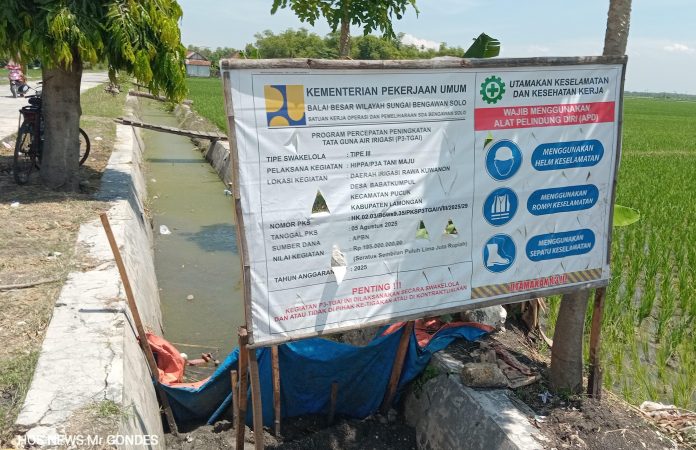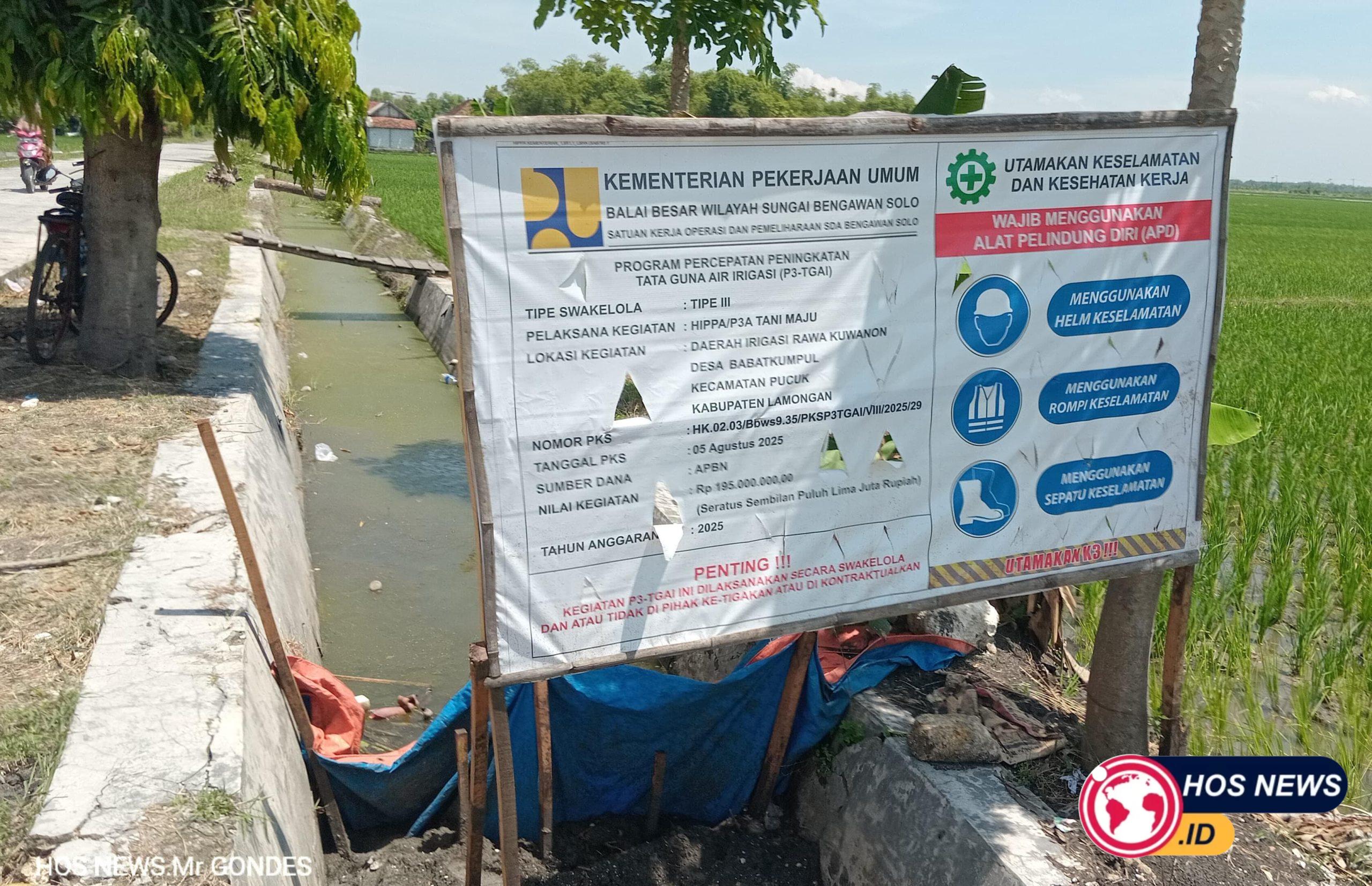 LAMONGAN, hosnews.id – Proyek irigasi Program Percepatan Peningkatan Tata Guna Air Irigasi (P3-TGAI) senilai Rp195 juta di Desa Babatkumpul, Kecamatan Pucuk, Kabupaten Lamongan, menuai kritik tajam. Temuan di lapangan memperlihatkan pengerjaan diduga tidak sesuai standar, pekerja mengabaikan keselamatan kerja, hingga penggunaan material yang dipertanyakan mutunya. Aktivis Komite Anti Korupsi Indonesia (KAKI) Jawa Timur menilai proyek yang dibiayai APBN 2025 itu berpotensi sarat penyimpangan dan korupsi.