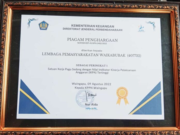 Waikabubak – Lembaga Pemasyarakatan Kelas IIB Waikabubak kembali menorehkan prestasi dalam bidang pengelolaan keuangan negara nominasi Pagu Sedang dengan meraih peringkat pertama Indikator Kinerja Pelaksanaan Anggaran (IKPA) Terbaik semester I Tahun Anggaran 2022 dari Kantor Pelayanan Perbendaharaan Negara (KPPN) Waingapu pada Jumat (12/08/2022).