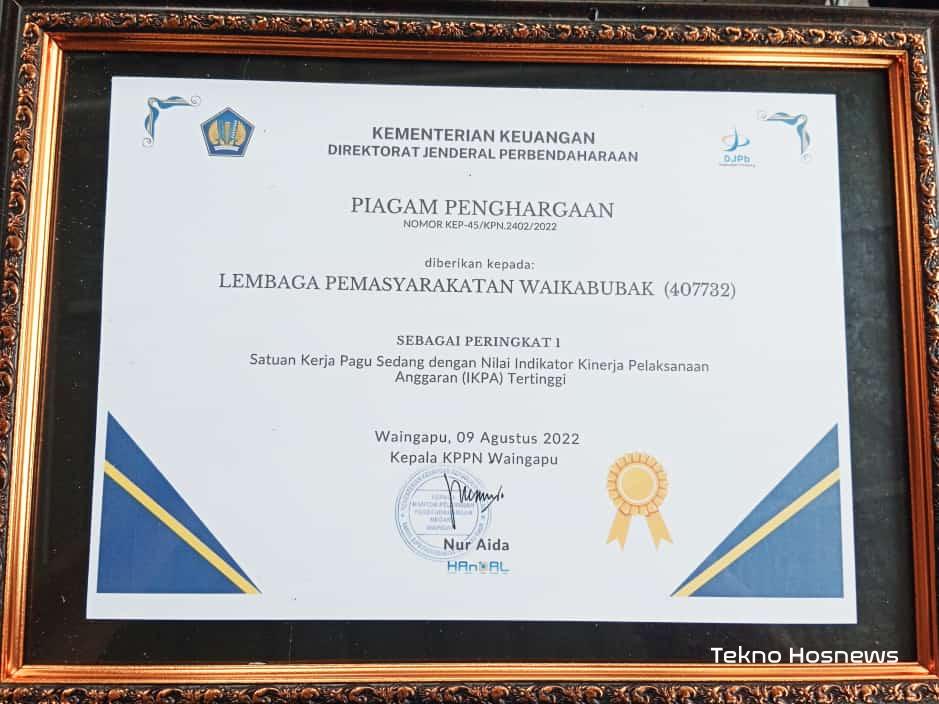 Penghargaan ini diserahkan langsung oleh Kepala KPPN Waingapu, Nur Aida kepada Kepala Sub bagian Tata Usaha Lapas Kelas IIB Waikabubak, Hermanus Sadhu di Aula KPPN Waingapu.