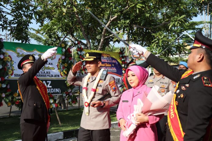 SAMPANG – Polres Sampang kembali menggelar tradisi pedang pora untuk menyambut kedatangan AKBP Siswantoro S.IK, M.Si sebagai Kapolres Sampang bertempat di pintu masuk Mapolres, sabtu (21/01/2023) pagi.