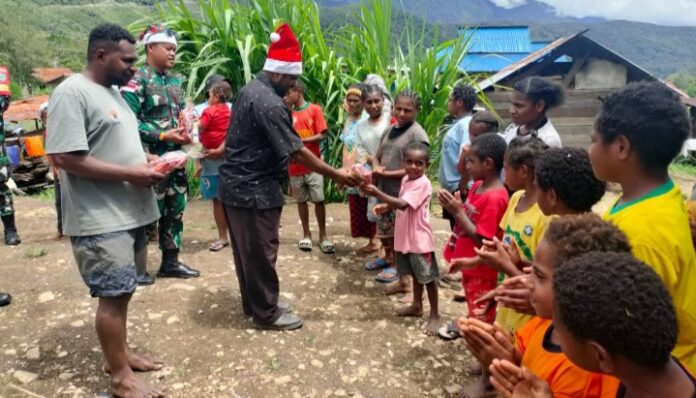 Kegiatan bakti sosial Koramil Oksibil di Kampung Kutdol Okpol dengan membagikan 100 bingkisan Natal kepada anak-anak sekolah Minggu Gereja Katholik Okpol.